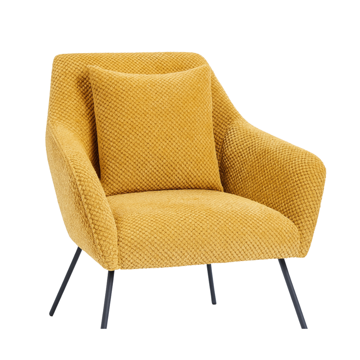העיצוב המעוגל של הגב והידיות יוצר חיבוק נעים ותומך, בעוד שרגלי המתכת הדקות בסגנון מודרני מעניקות לכורסה מראה קליל ומרחף.