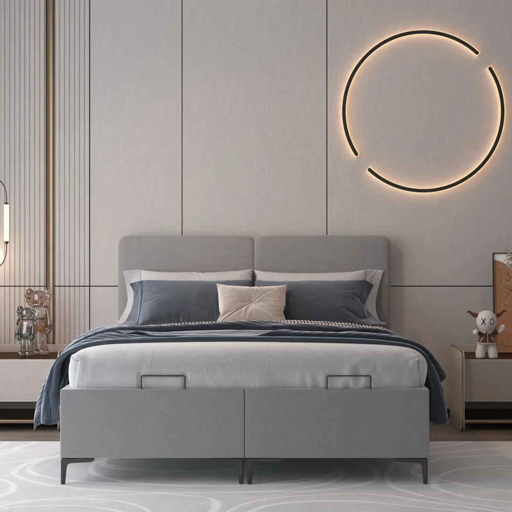 המיטה מגיעה בגוון אפור אלגנטי, המתאים לכל סגנון עיצובי ומעניק לחלל תחושת רוגע ויוקרה.