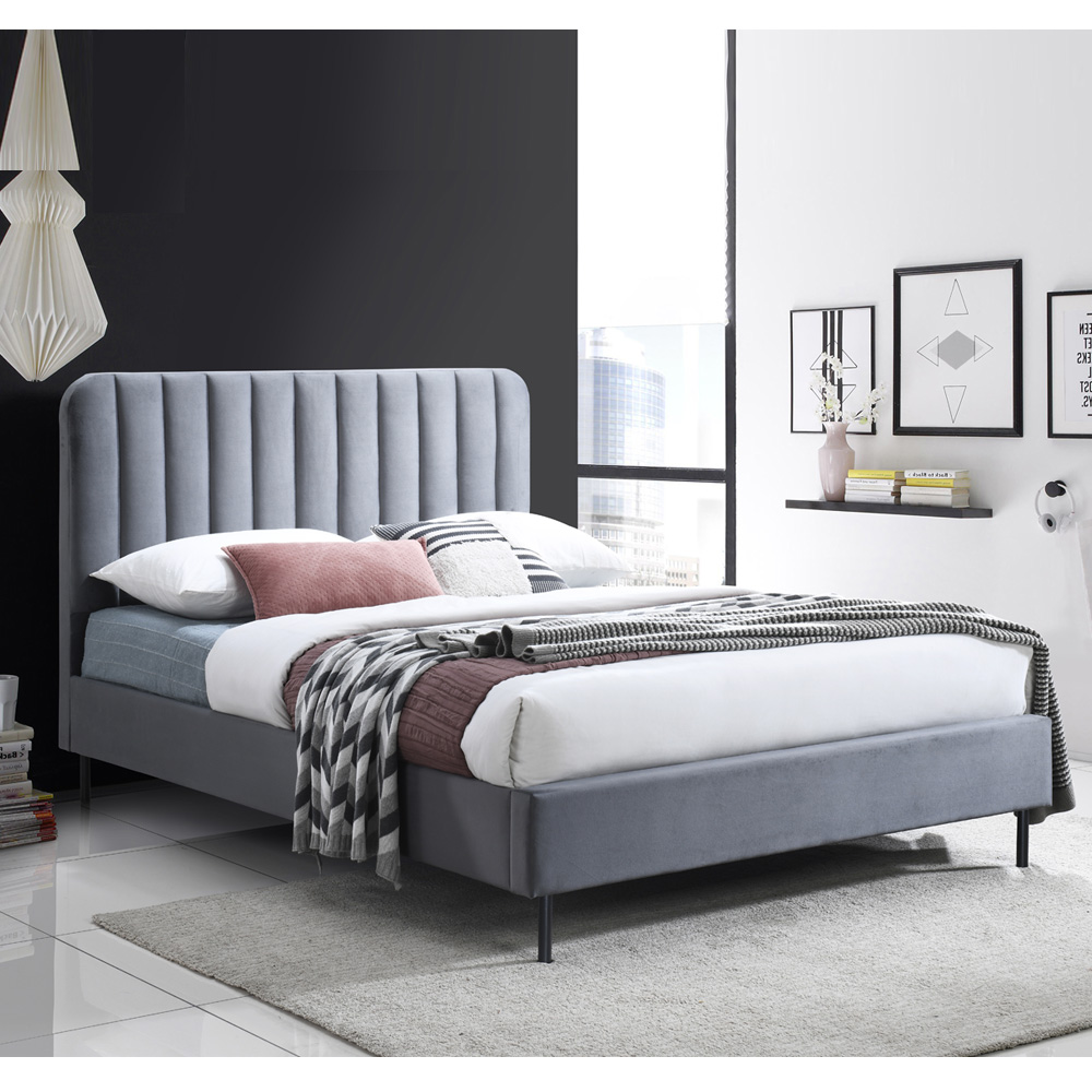 מיטה זוגית 140×190 ס"מ בעיצוב מודרני ואלגנטי, מרופדת בד קטיפתי רך ונעים למגע בכל החלקים הגלויים – כולל בראש המיטה המעוצב.