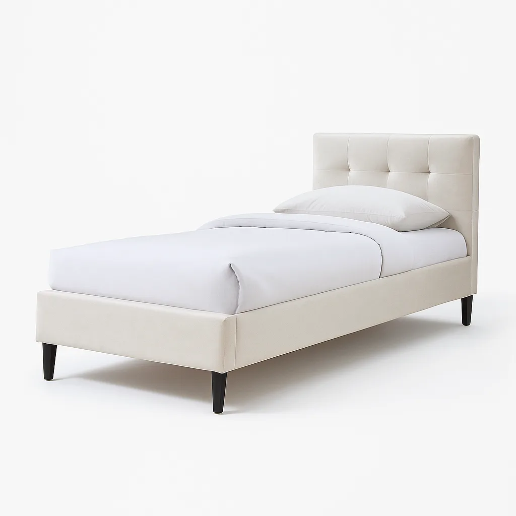 מיטת יחיד מעוצבת בעדינות ובסטייל מודרני, המשלבת נוחות מקסימלית עם מראה אלגנטי ומזמין.