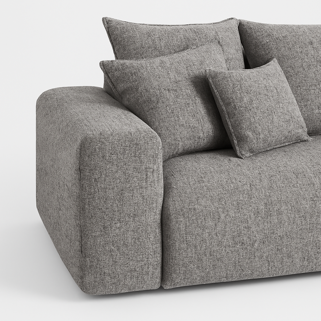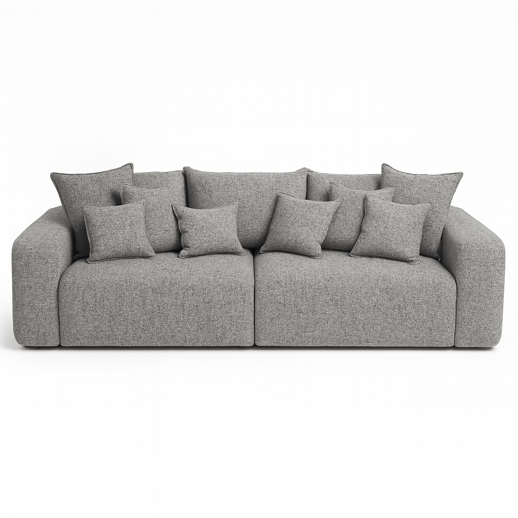 הספה מגיעה עם מושבים רחבים ועמוקים במיוחד, משענות גב מרופדות וכריות נוספות למראה עשיר ומפנק — כזה שמזמין לשקוע פנימה ולהירגע.